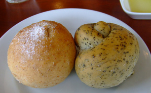 私が食べたのはAセットで、パンバイキングにメンイディッシュを5つの中から選ぶタイプ。それに単品の湘南野菜のシンプルサラダとクーポンを持ってミニデザートをゲットしてきました。パンは、最初だけウェイターさんが籠を持ってきてパンの説明をした後、好きなものを取ってくれます。あとは、テーブルにおいてあるのを自分で好きにとりにいくというものです。赤ワインのパンにバジルパン・スパイスパンをチョイス。赤ワインは写真をとる前に食べました。しまったー!