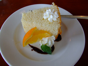 でもって、クーポン提示でついたデザートはミニシフョンケーキ。味はオレンジでチョコシロップでハートが書いてあり、オマケなのにしっかり飾ってあるお店の姿勢にちょっと感動。